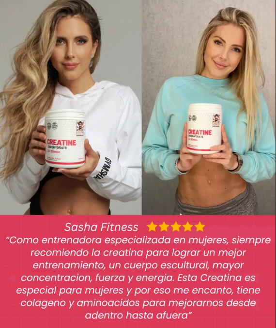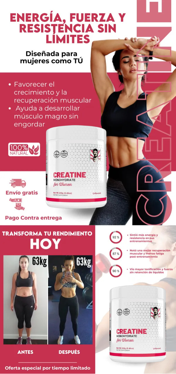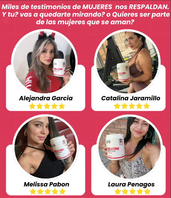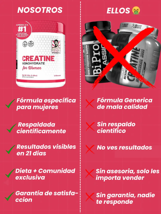Nuestra Creatina está formulada exclusivamente para mujeres, combinando creatina premium + colágeno. No es una fórmula masculina "adaptada", es pensada desde cero para ti.