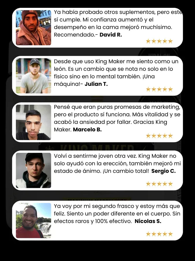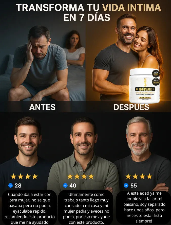 Para nada. King Maker Plus™ está diseñado tanto para quienes entrenan como para hombres que buscan más energía, mejor concentración, mejor humor y un impulso en su vida íntima, sin necesidad de rutinas intensas.